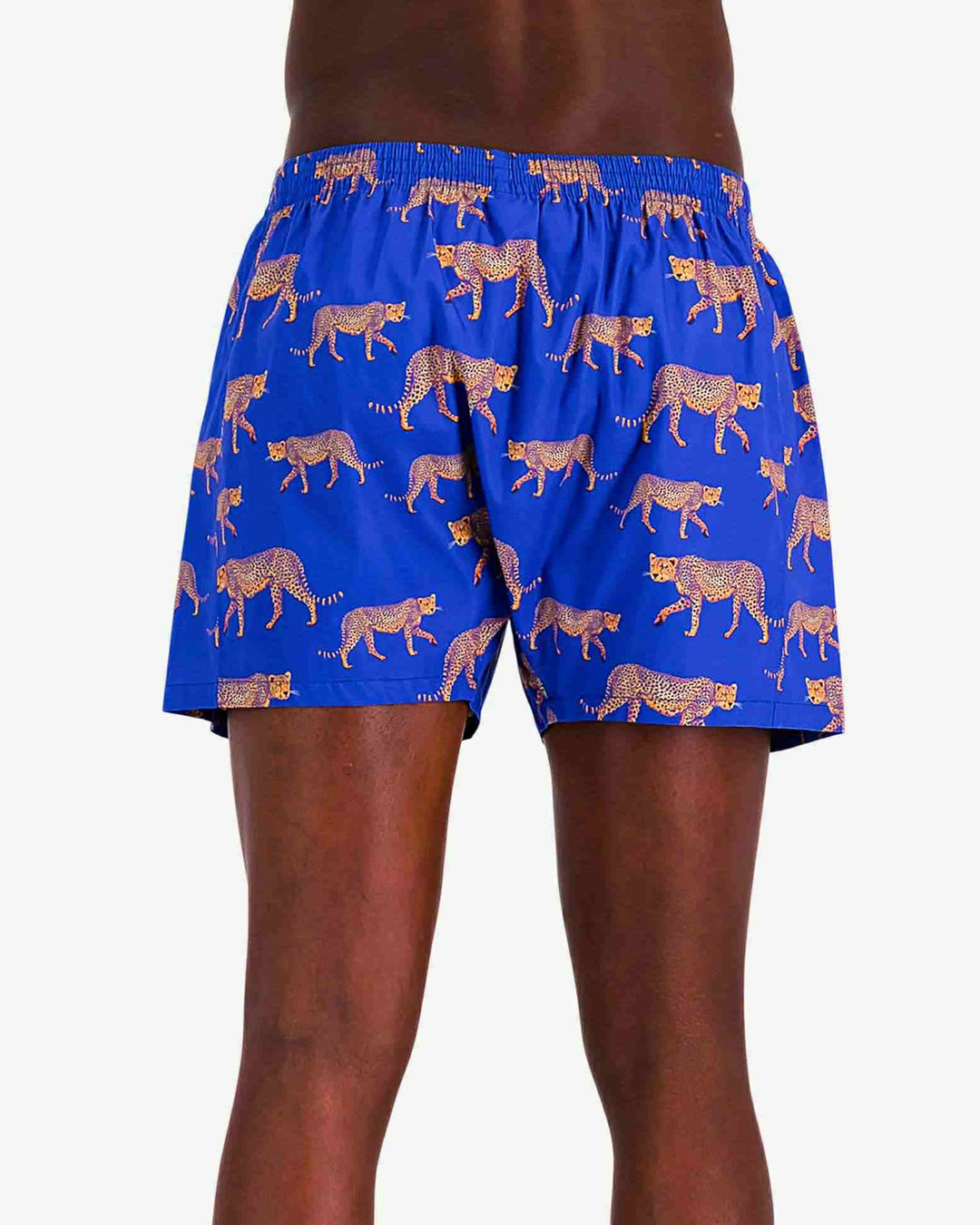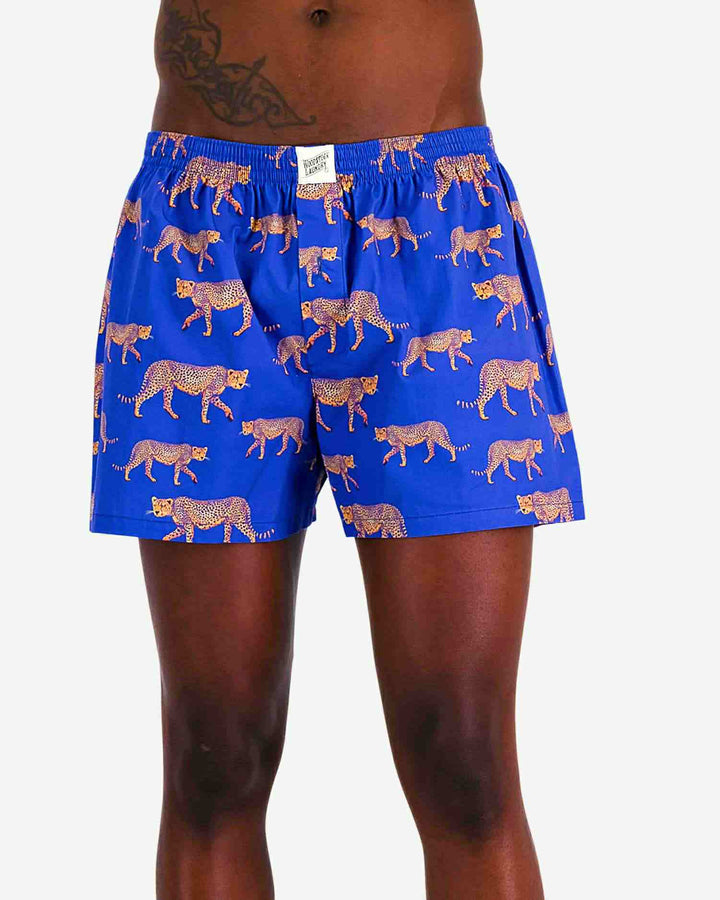 Part of our funny boxers collection – cheetah boxers printed on blue cotton with a subtle purple cast. Also part of our sexy boxers edit – bold, refined, and designed to stand out.
