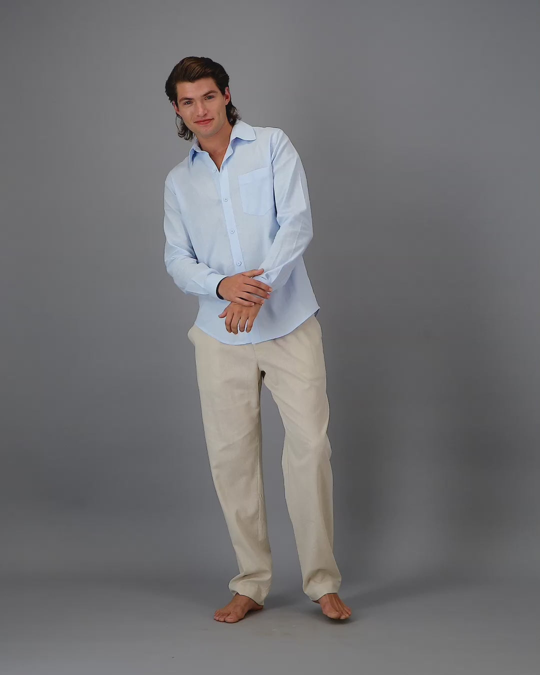 Luxuriöses und luftiges hellblaues Leinenhemd für Herren.