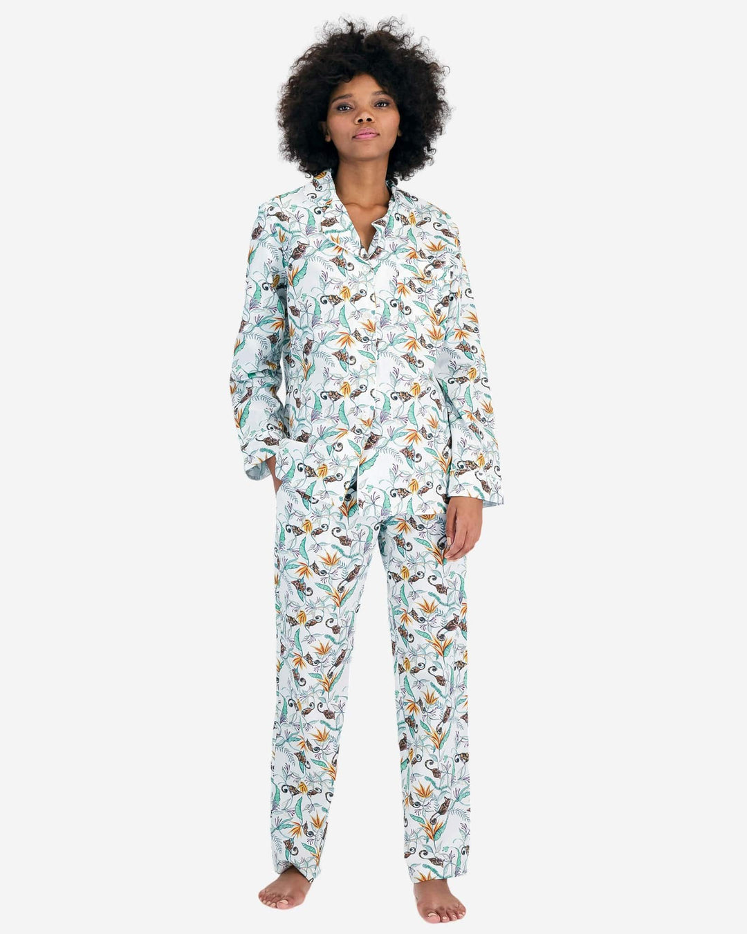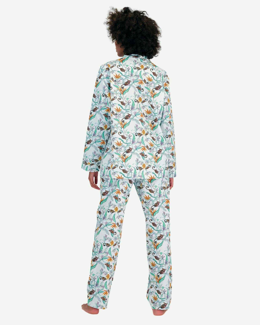 Unser Damen-Schlafanzug wird sorgfältig in unserer eigenen kleinen Fabrik in Kapstadt handgefertigt, unter Verwendung von ethisch bezogener Bio-Baumwolle.