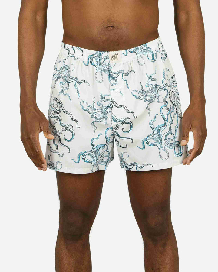 Weisse Boxershorts für Herren mit einem verspielten Design aus indigo Tintenfischen.