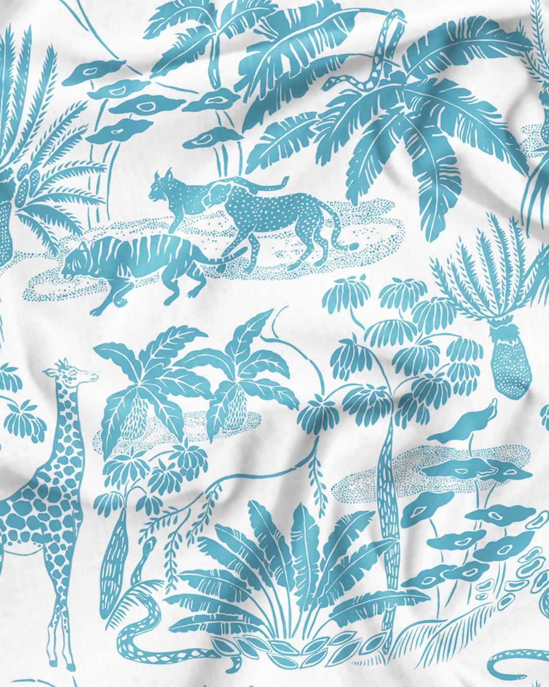 Mono Safari Blue – Verspielte Safaritiere und Palmen, in Blau von Hand illustriert, auf frischem Weiß. Natürlich, lebendig und einzigartig.
