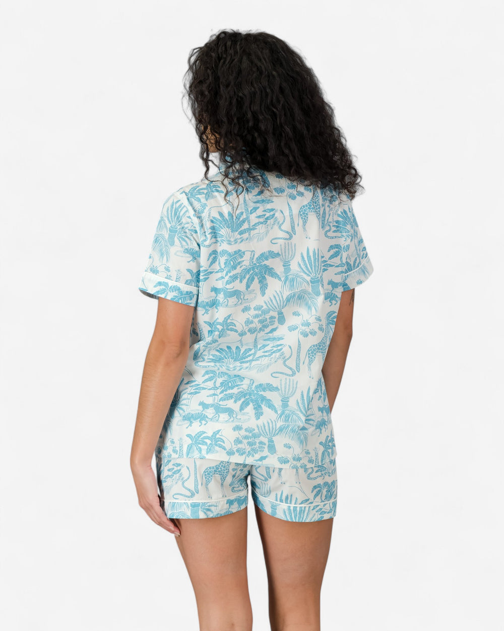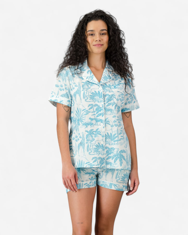 Kurzer blauer Damen-Schlafanzug mit handgezeichnetem Safarimuster