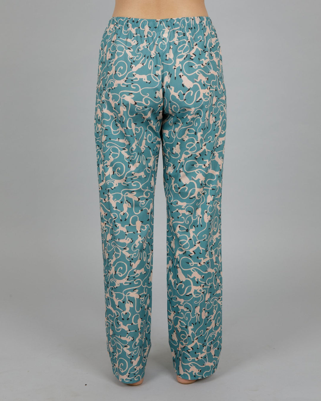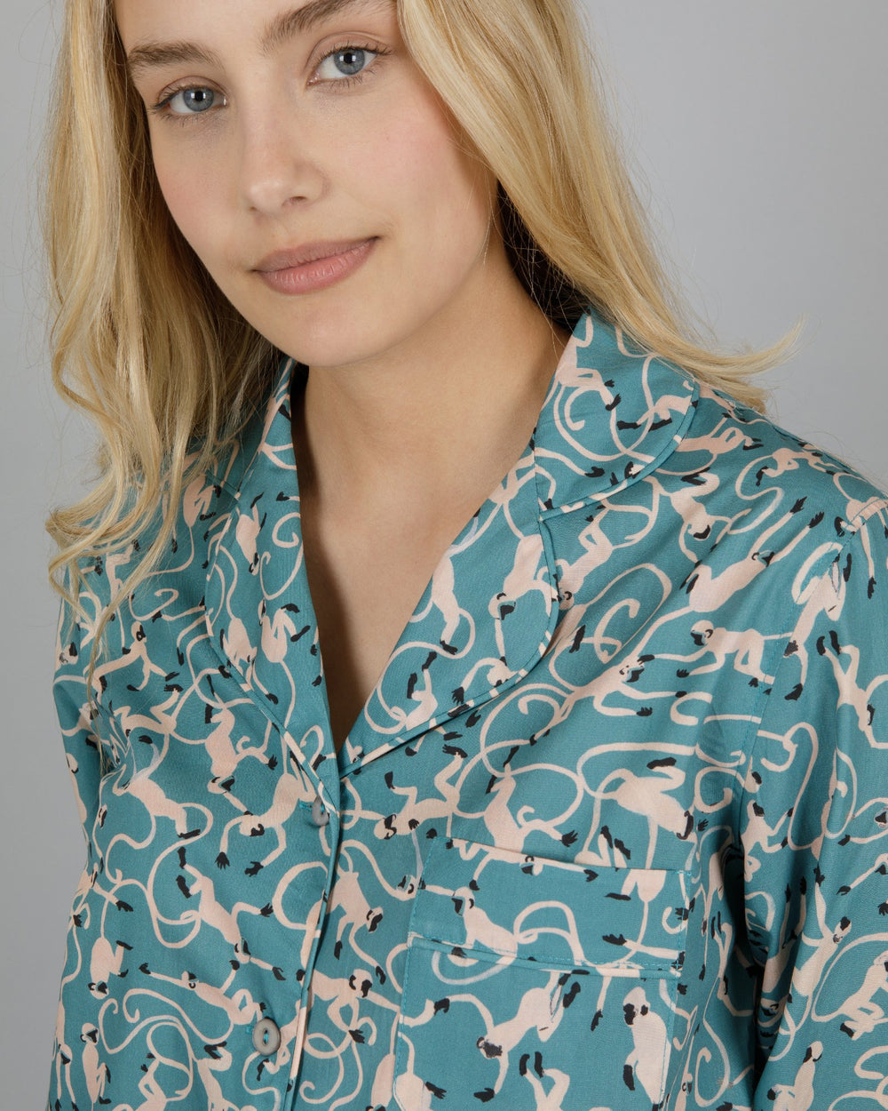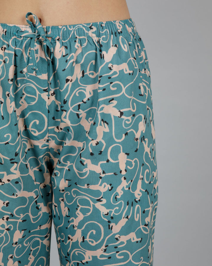 Monkey Teal – Inspiré par notre amour de la nature, cet imprimé unique met en scène des singes dessinés à la main et apporte une touche à la fois ludique et élégante à votre pyjama.
