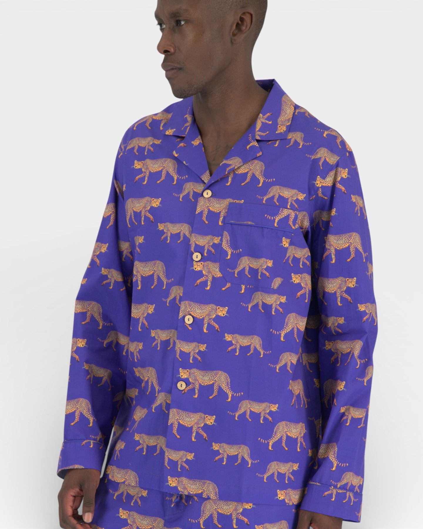 Complete your nightwear with these men's blue pyjamas, featuring a novelty print of playful cheetahs. These funny and stylish pyjama sets are perfect for those looking to combine comfort with a unique, eye-catching design.