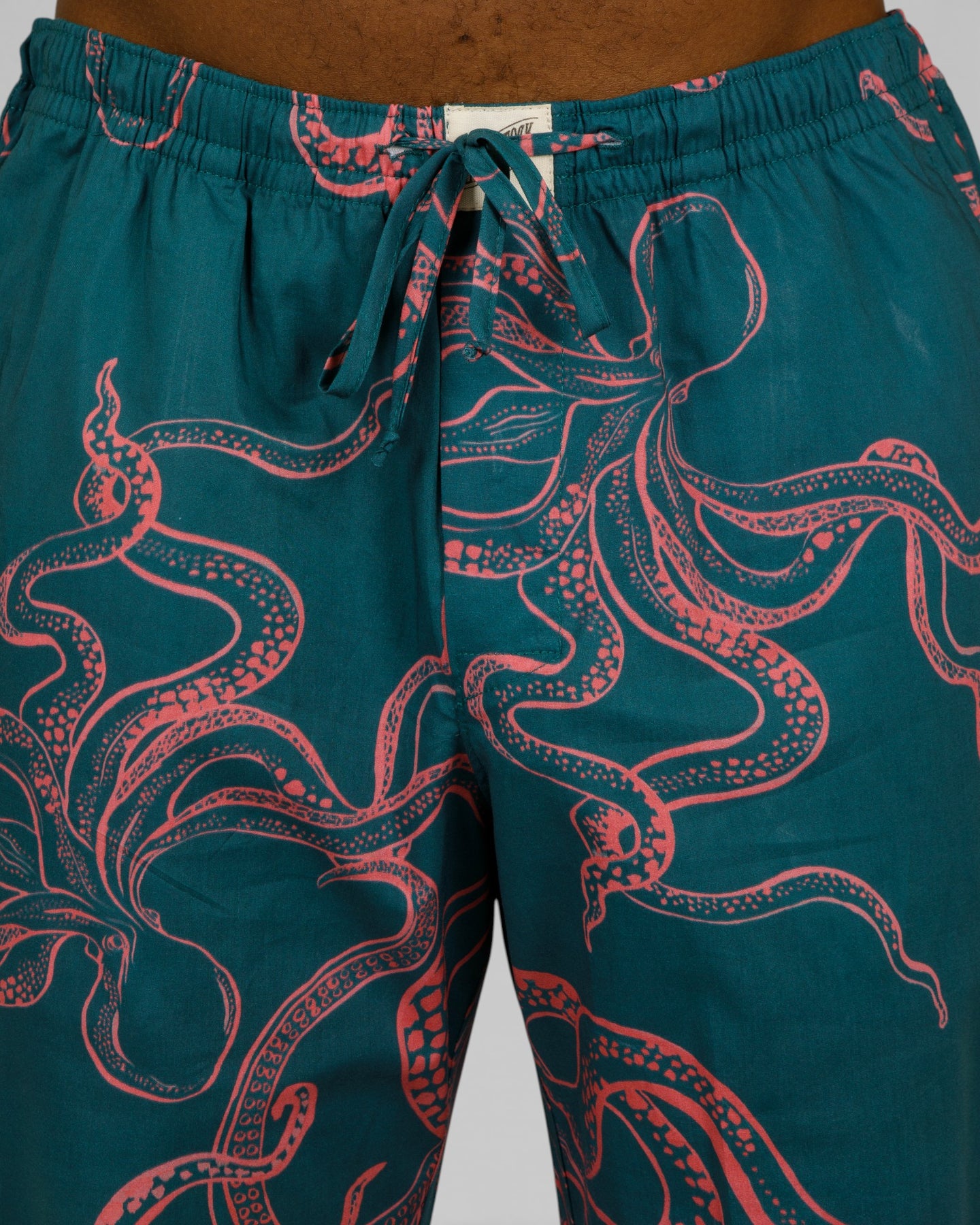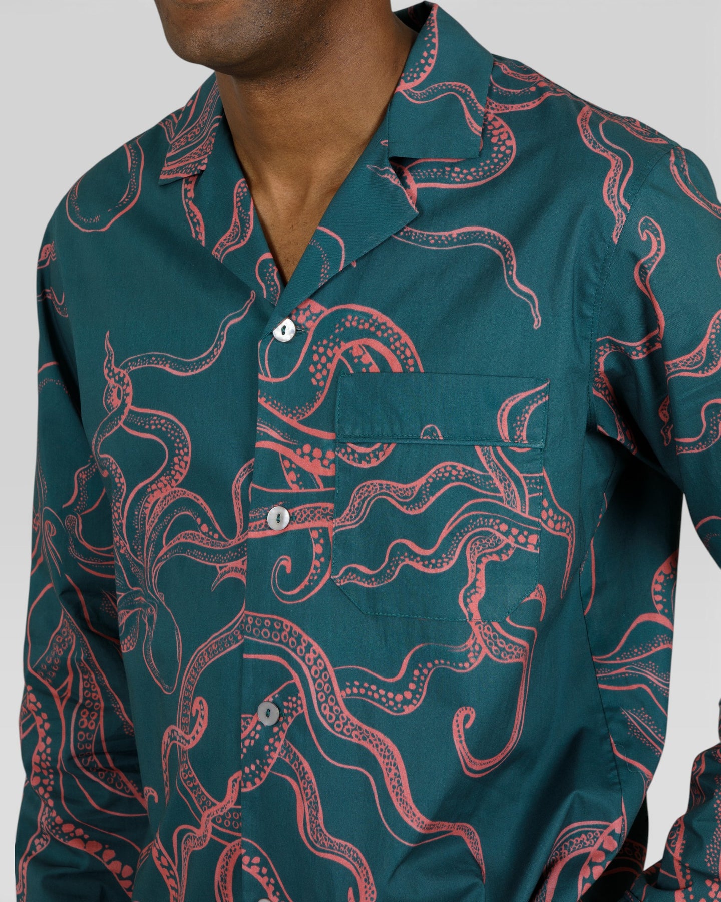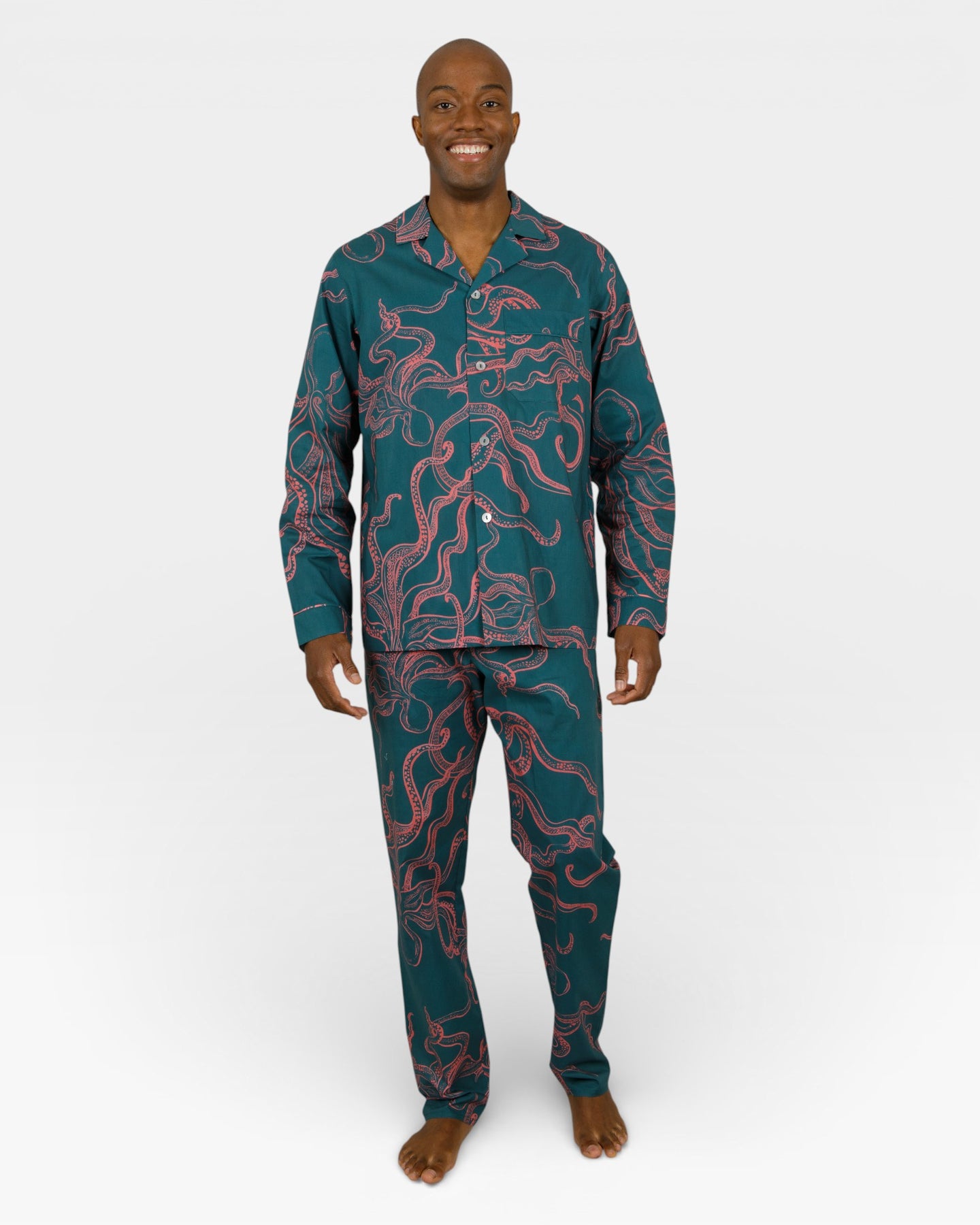 Grön pyjamas för herr med ett vackert mönster av rosa bläckfiskar.