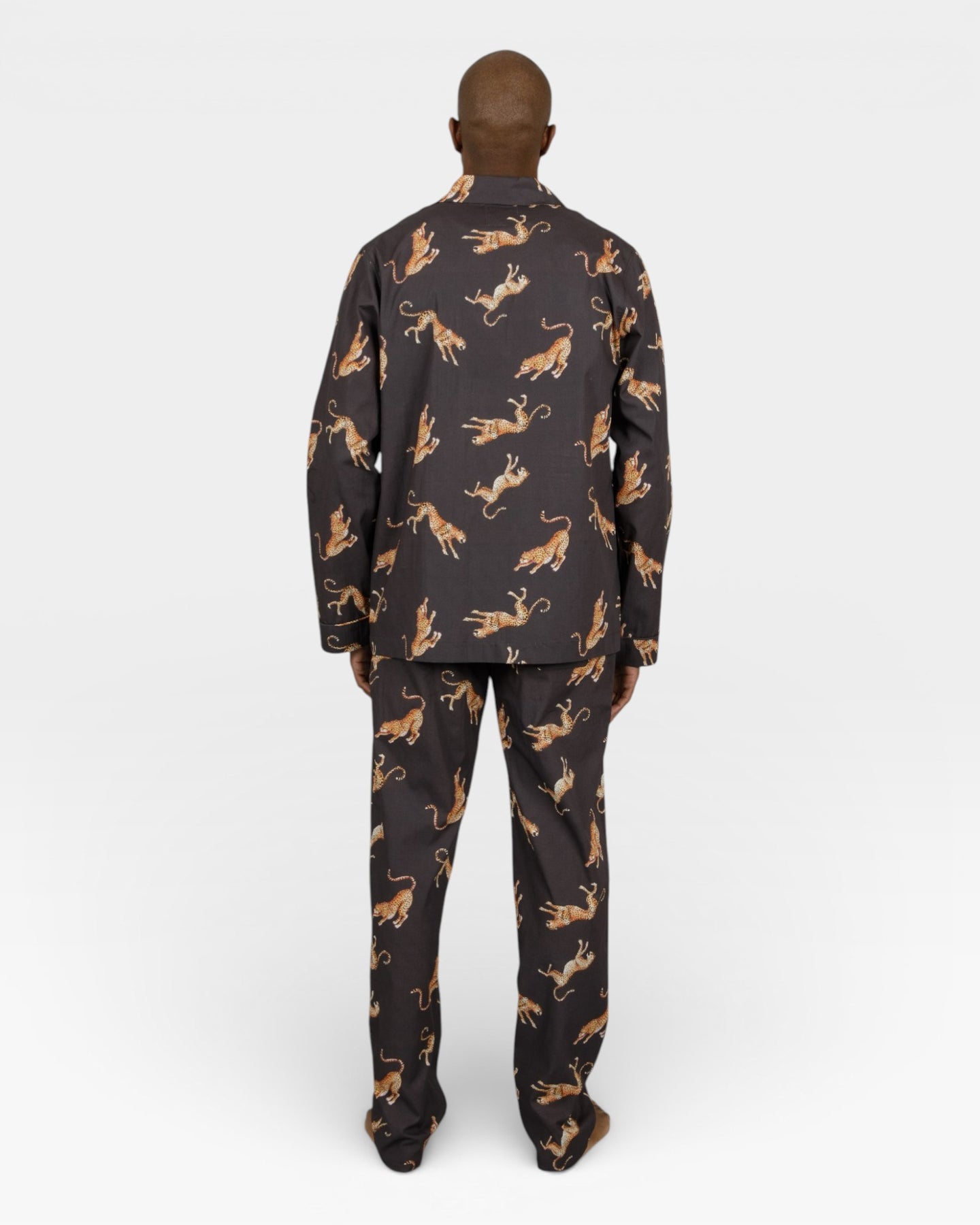 Antracitfärgad pyjamas för herr med mönster av hoppande geparder.