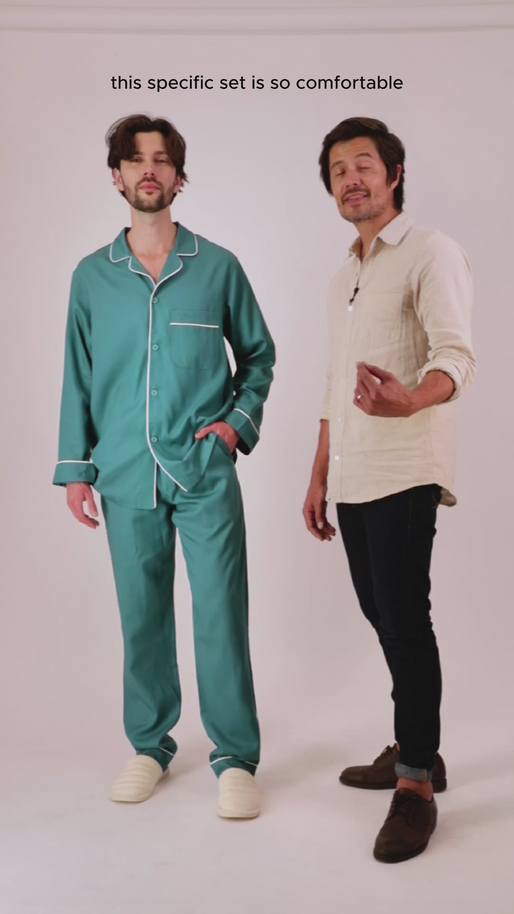Herrmodell: Skjorta med knäppning, definierad krage och bröstficka. Byxa med resår i midjan, justerbar dragsko, gylf med corozo-knapp, två sidfickor och en bakficka.